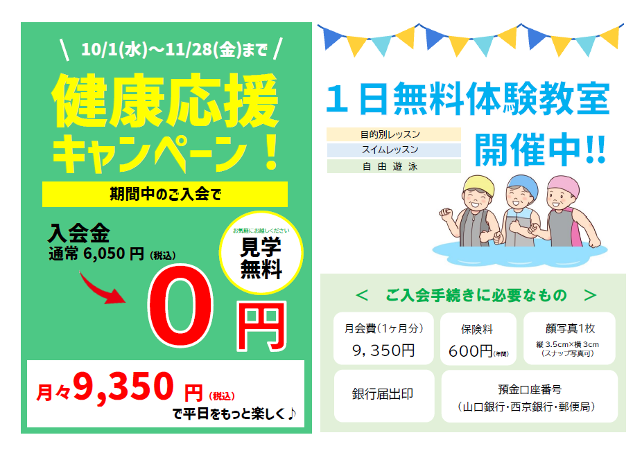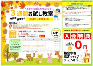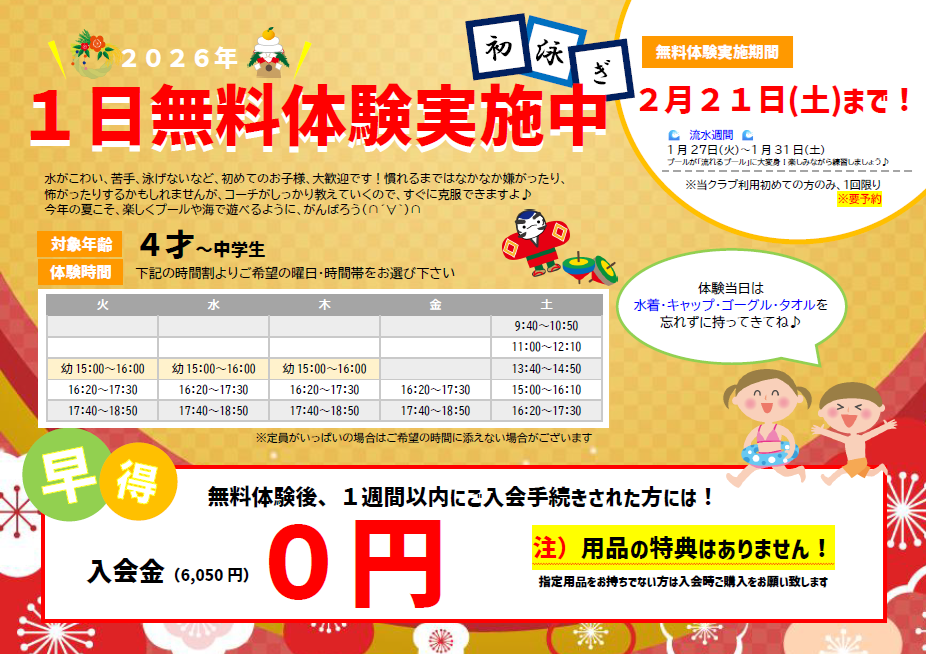 ※体験当日は水着・キャップ・ゴーグル・タオルを